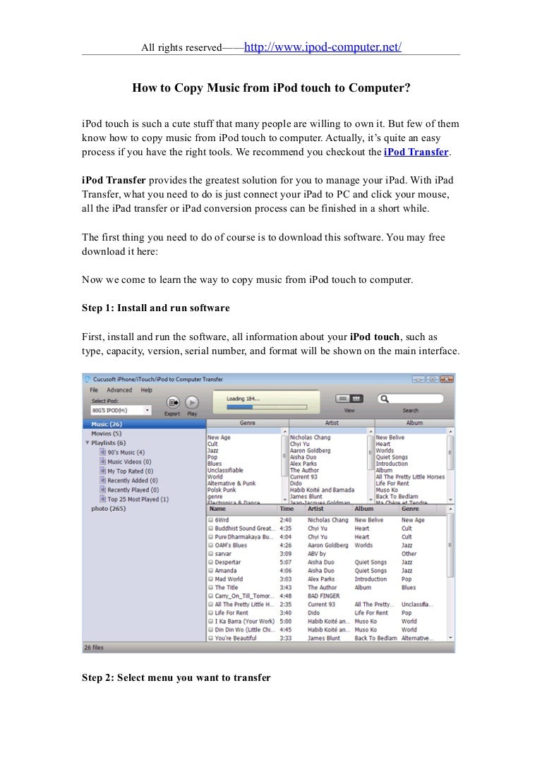 This article explains how you can transfer photos from your ipod to various devices, step by step, there are the instructions for transfer from ipod to the computer, ipod touch to iphone, and ipod to imac step 3 import photos from ipod to pc. Open the photos app on your that's all about how to get photos from ipad to computer. You can use the photos app to import photos from your iphone, ipad, or ipod touch to your mac. Connect the device to your computer using a usb cable. This method can meet your need if transferring all photos. I heard this ipod to computer/itunes/ipod transfer works pretty good on this. Be sure itunes and the program are all installed on your computer well, and link your ipod touch, ipod nano or ipod classic to computer via its usb cable. How to copy playlist from iphone, ipad, or ipod to… iphone, ipad, or ipod touch: How to copy photo from ipod touch 5 to computer? How to transfer iphone photos to mac: You can import photos to your pc by connecting your device to your computer and using the windows photos. For more information on how to transfer pictures from iphone to computer or laptop, please see the touchcopy user guide. You will then be shown a window displaying the number of pictures found and a few options.